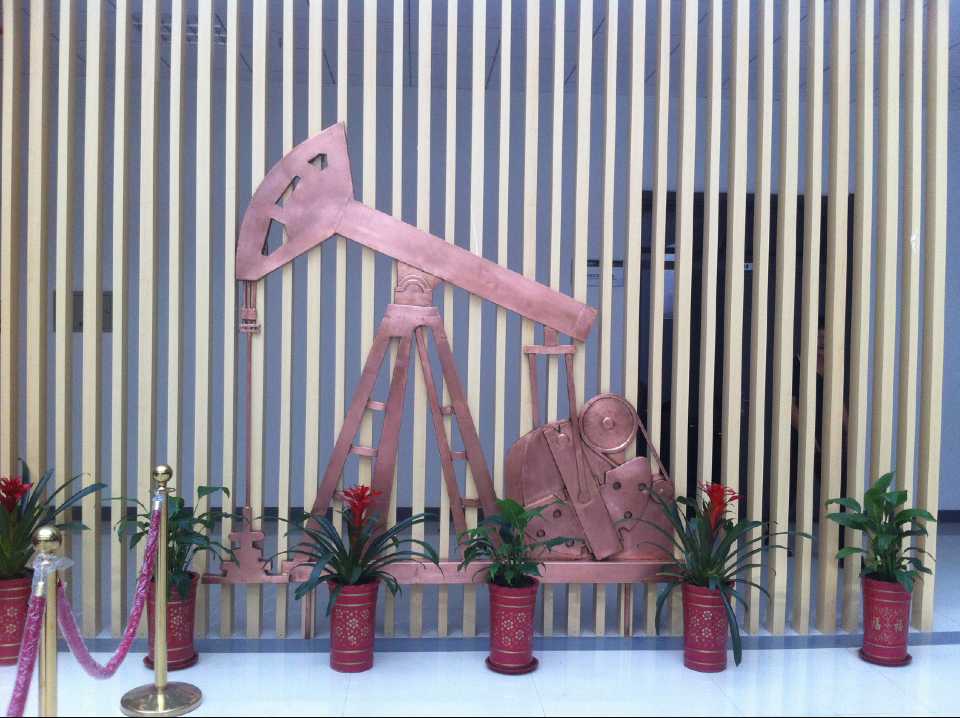 抽油機(jī)及化工廠鍛銅浮雕,2015年10月23日安裝于中國(guó)石油大學(xué)華東分校(青島市黃島區(qū))。材質(zhì):紫銅板。工藝:手工鍛銅。高:2.19米。