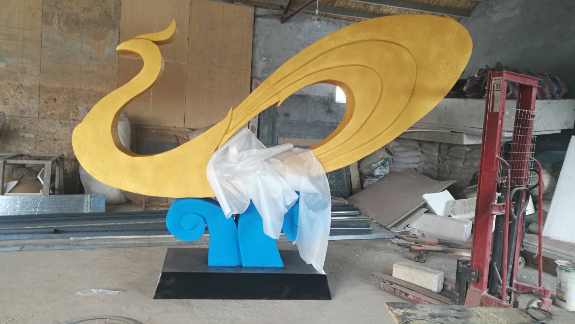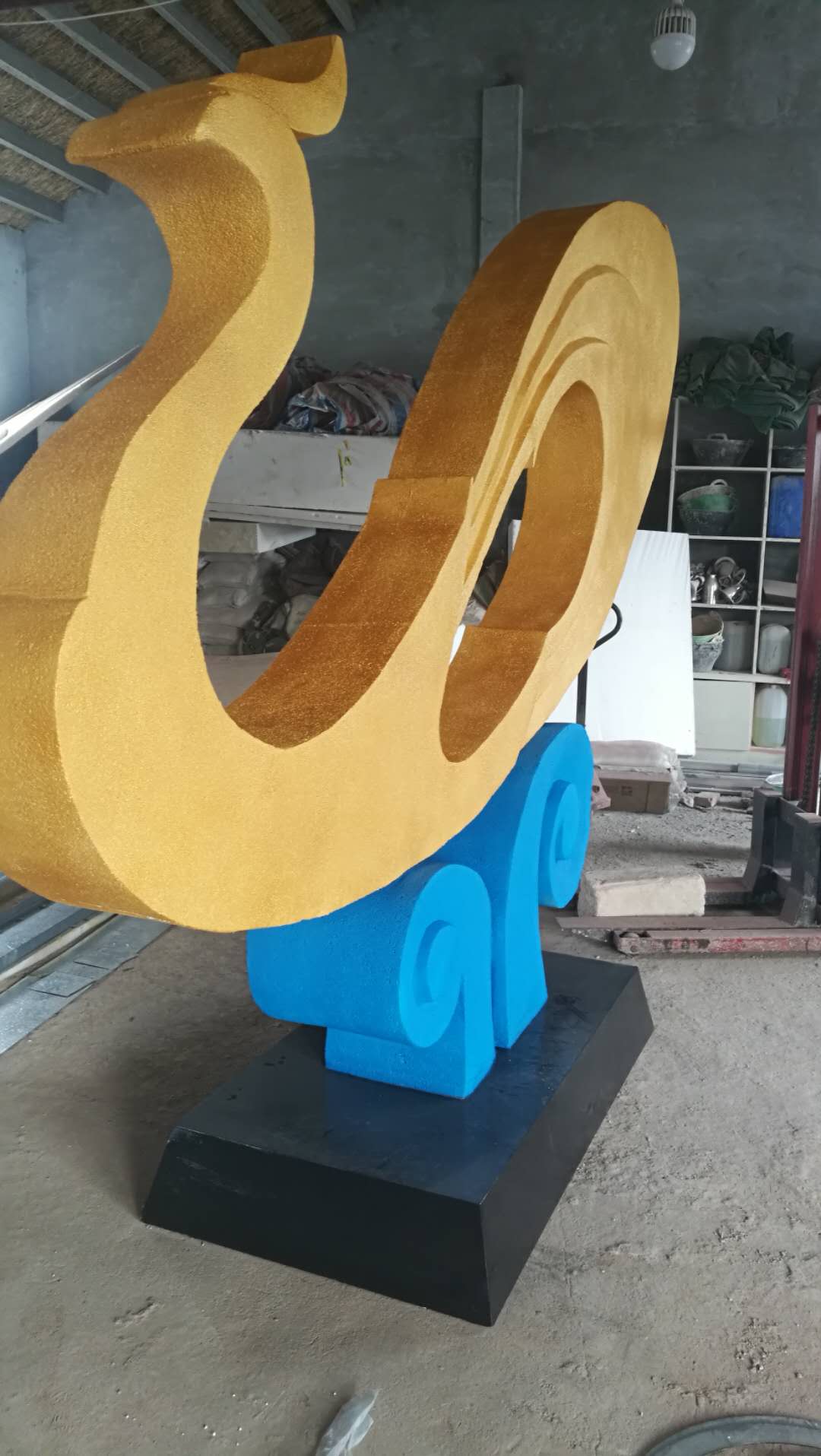 雕塑說明:本雕塑根據(jù)碧桂園的logo創(chuàng)作設(shè)計。雕塑高2.7米,長3.6米,上面孔雀表面沙金效果,浪花湖藍色,底座黑色。雕塑材質(zhì)為泡沫,表面仿砂巖效果,彩噴。