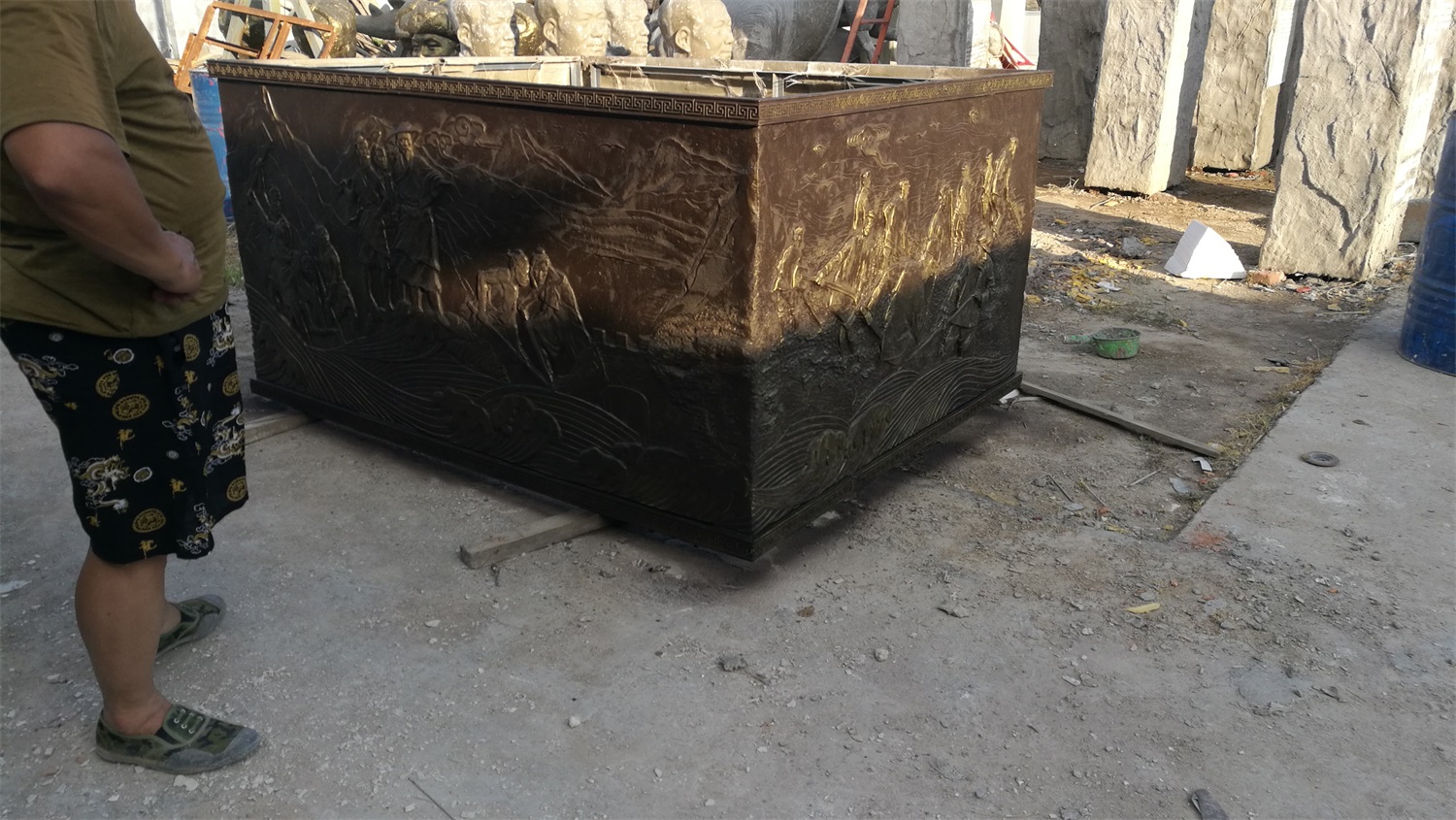 “黃河龍”象征黃河母親哺育中華民族生生不息,奮勇向前;也象征從古至今中華民族不屈不撓同黃河水患斗爭(zhēng)的偉大精神;雕塑各分支代表黃河支流匯集,驚濤駭浪,氣勢(shì)雄渾。浮雕部分以黃河河道全貌貫穿四面,配以古今抗洪搶險(xiǎn)的偉大事跡。